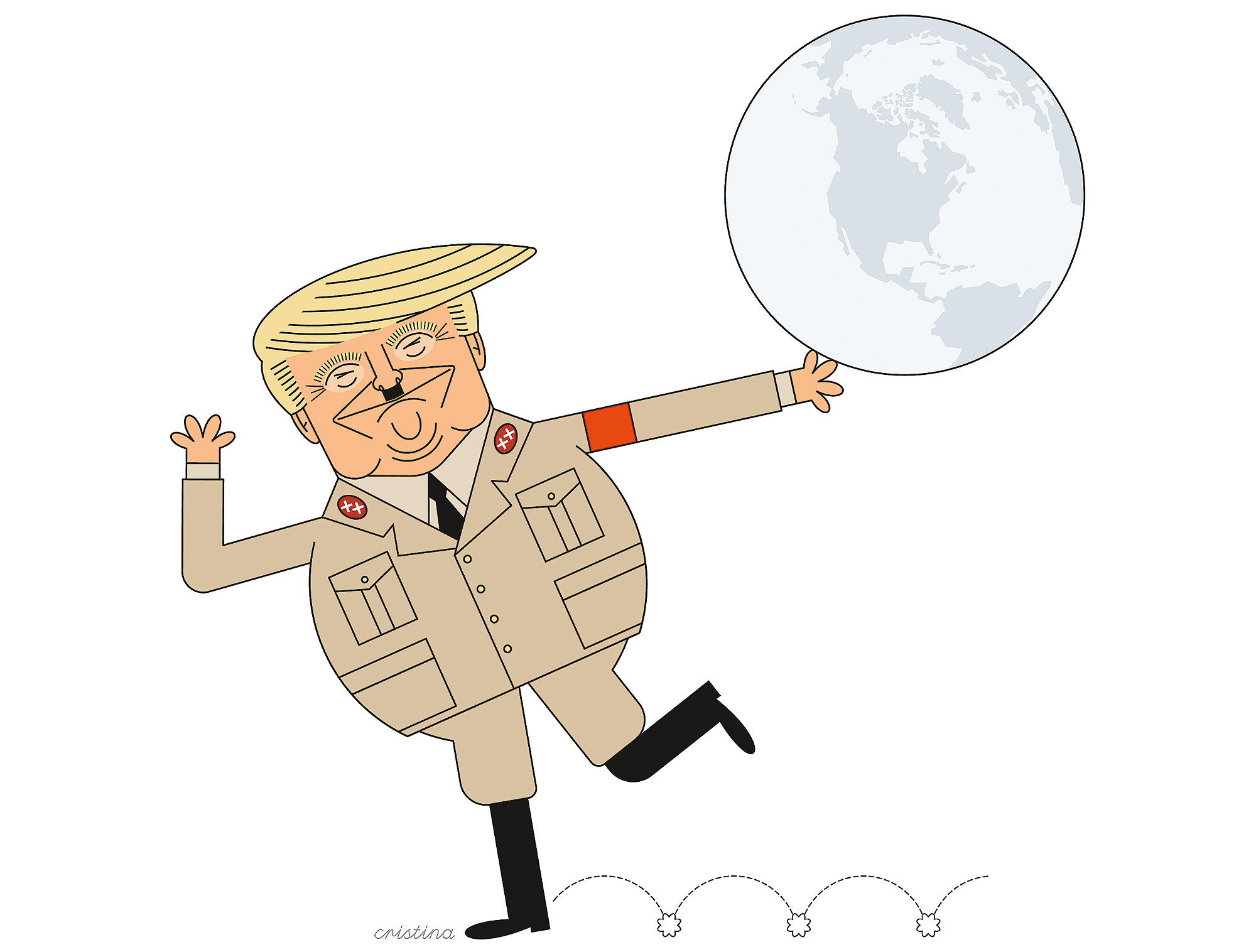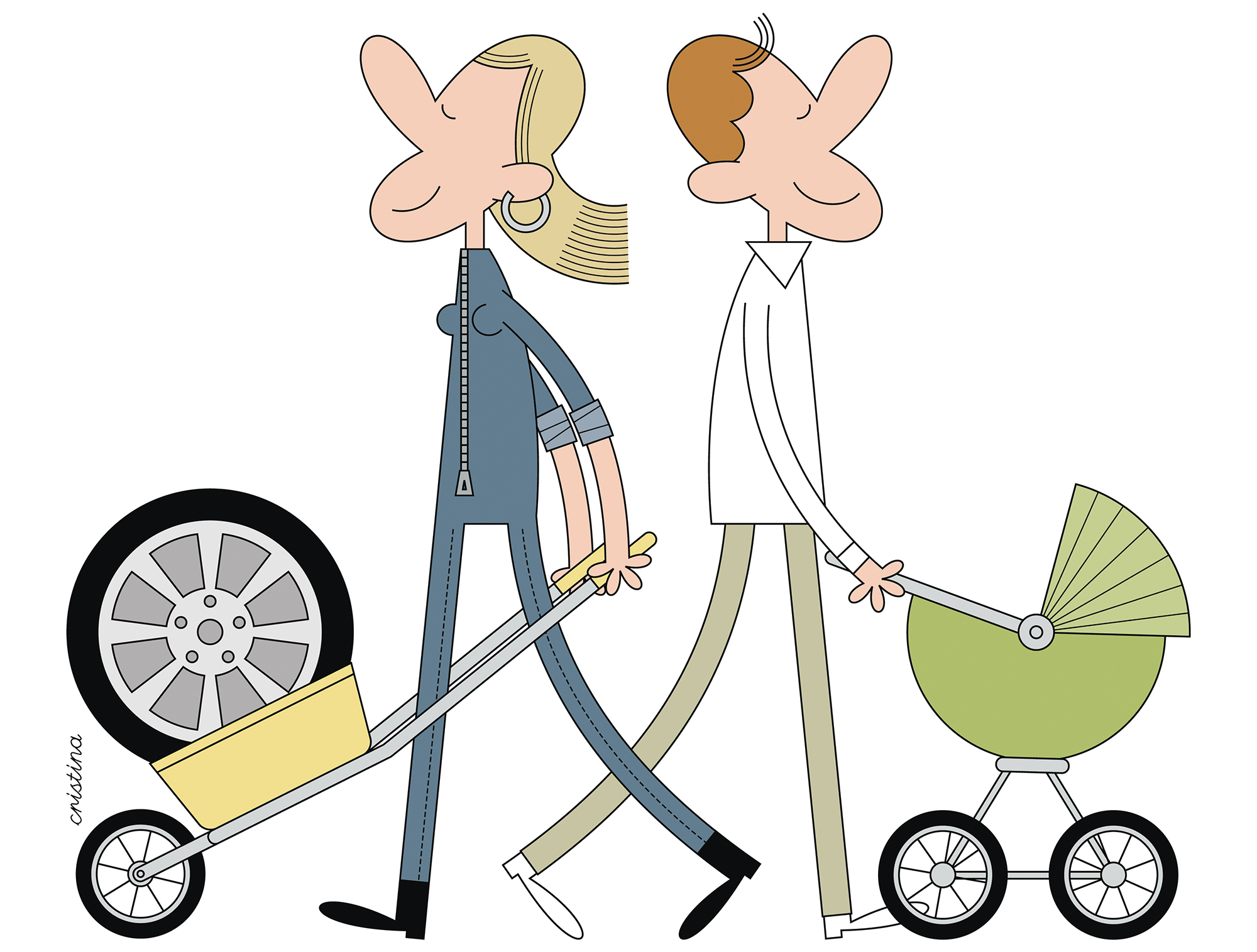 Não se iludam: a linha clara de digital pureza é bem negra e hábil a escavar na analógica e contraditória natureza humana. É linha de polígrafo treinado a apanhar os mentirosos, os sonsos e os estúpidos do planeta inteiro, é espelho de cores amáveis que reflete o nosso sorriso, profundamente amarelo. É linha sem mestre nem discípulos, avis rara do desenho de humor português e internacional, de tão simples aparência quanto profunda e sofisticada arquitetura, linha fluida que cumpre geometrias rigorosas e se desorganiza em quilométricos narizes e braços tentaculares que terminam em económicos quatro dedos. Contorcionistas de circo, os bonecos de Cristina não se constrangem às leis da anatomia ou da perspetiva e o seu anamorfismo não carece de realismo ou palavras.